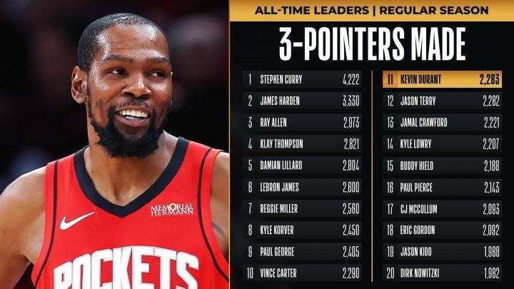 上半场命中第二记三分后,杜兰特生涯三分总数来到2283个,成功超越贾森特里升至NBA历史第11名,排在第10名的是文斯卡特(2290个)。